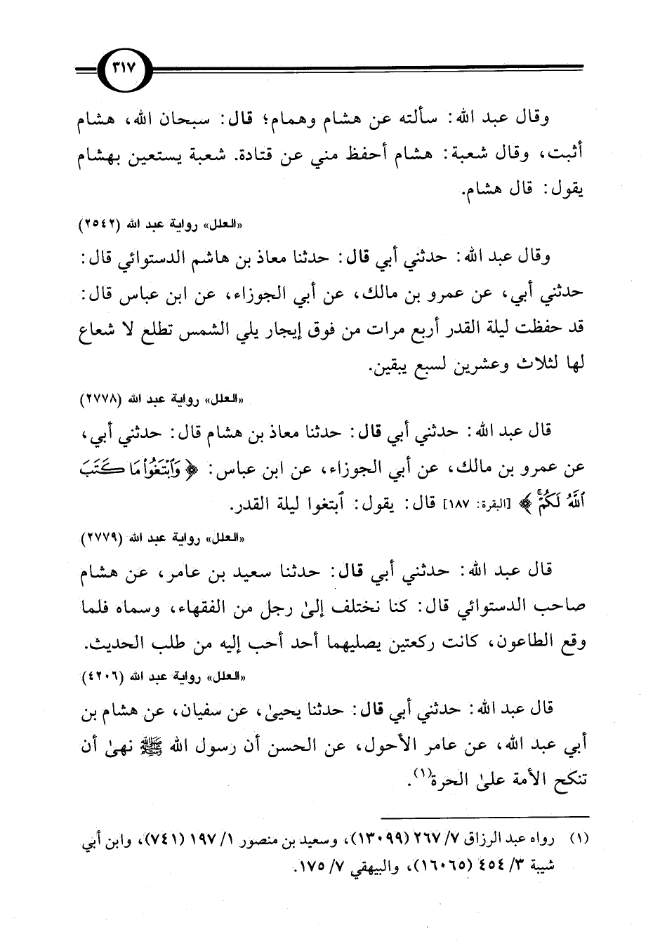 وقال عبد اللَّه: حدثني أبي قال: حدثنا معاذ بن هاشم الدستوائي قال: حدثني أبي، عن عمرو بن مالك، عن أبي الجوزاء، عن ابن عباس قال: قد حفظت ليلة القدر أربع مرات من فوق إيجار يلي الشمس تطلع لا شعاع لها لثلاث وعشرين لسبع يبقين.