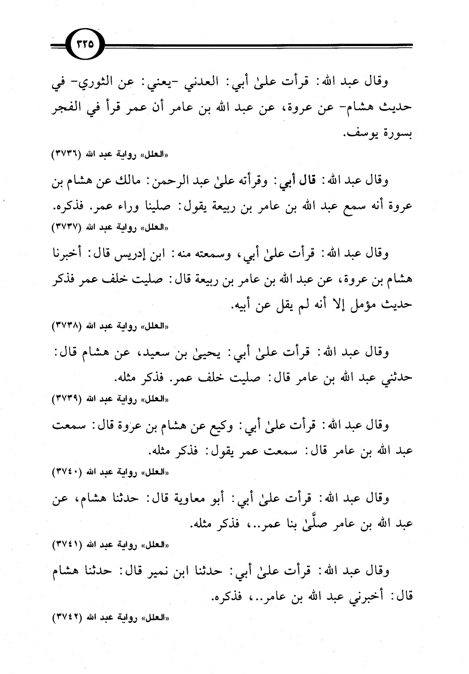 وقال عبد اللَّه: قال أبي: وقرأته على عبد الرحمن: مالك عن هشام بن عروة أنه سمع عبد اللَّه بن عامر بن ربيعة يقول: صلينا وراء عمر. فذكره.