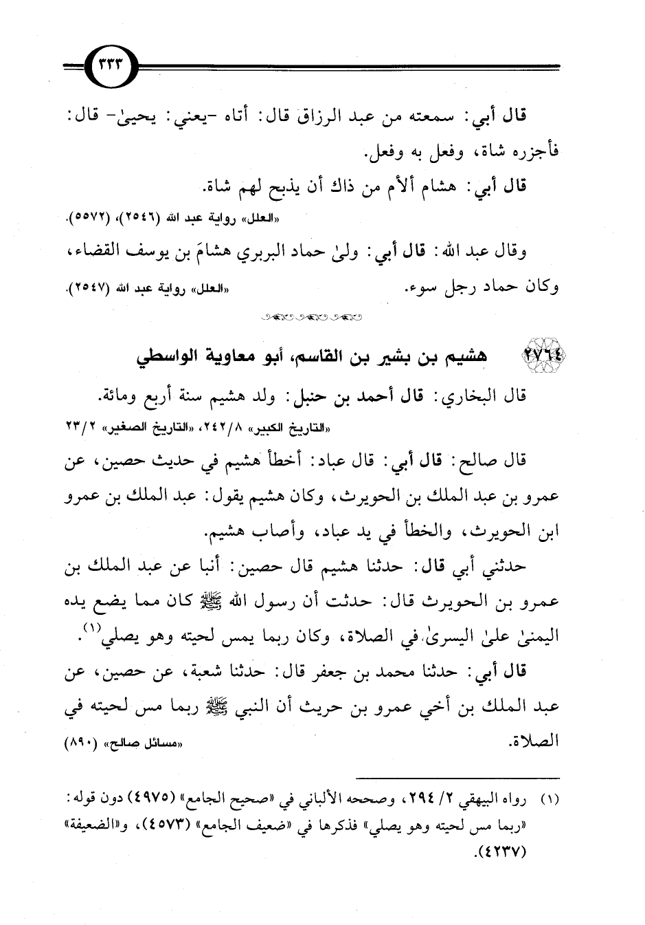 حدثني أبي قال: حدثنا هشيم قال حصين: أنبأ عن عبد الملك بن عمرو بن الحويرث قال: حدثت أن رسول اللَّه -صلى اللَّه عليه وسلم- كان مما يضع يده اليمنى على اليسرى. في الصلاة، وكان ربما يمس لحيته وهو يصلي (¬1).