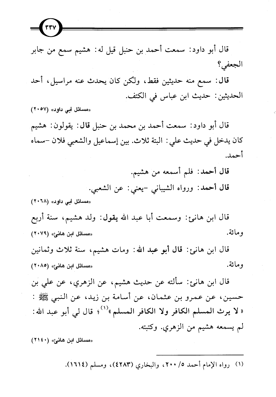 قال ابن هانئ: سألته عن حديث هشيم، عن الزهري، عن علي بن حسين، عن عمرو بن عثمان، عن أسامة بن زيد، عن النبي -صلى اللَّه عليه وسلم-: "لا يرث المسلم الكافر ولا الكافر المسلم" (¬1)؟ قال لي أبو عبد اللَّه: لم يسمعه هشيم من الزهري. وكتبته.