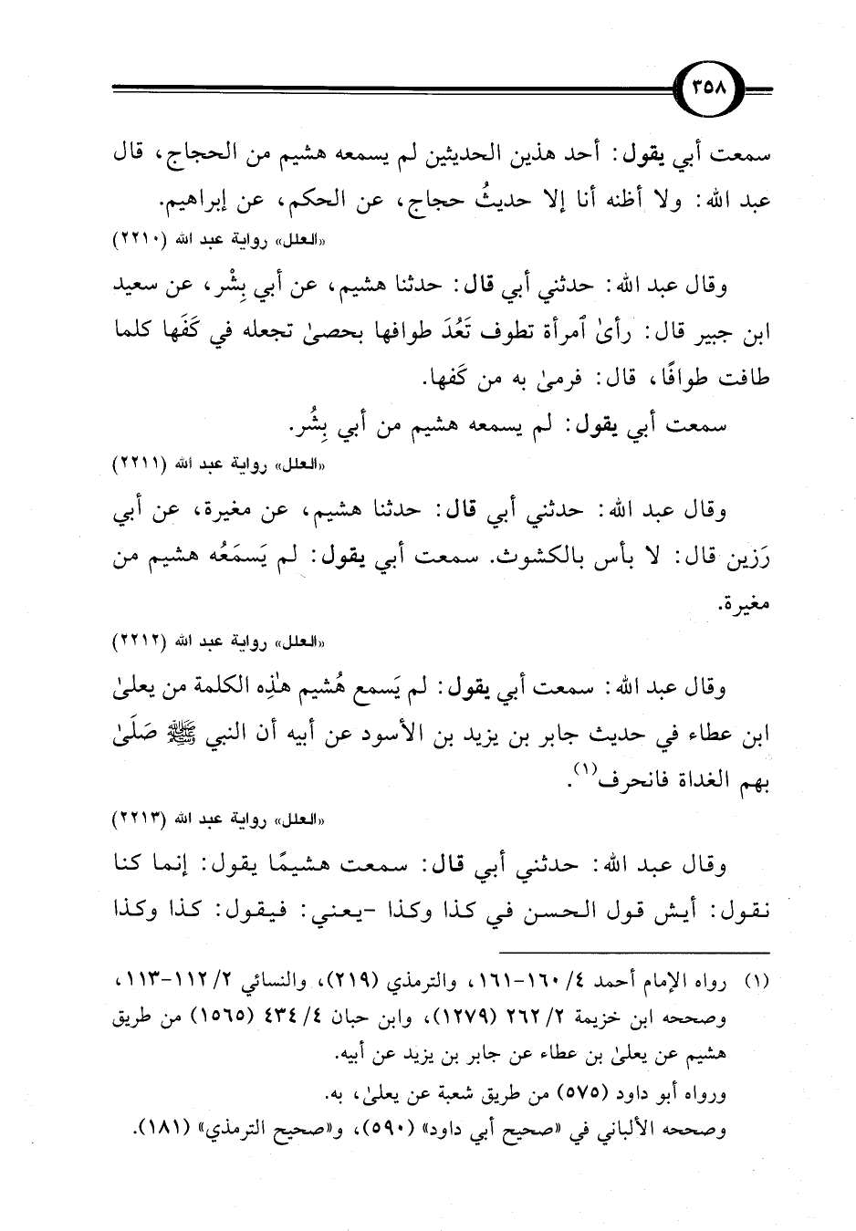 سمعت أبي يقول: أحد هذين الحديثين لم يسمعه هشيم من الحجاج، قال عبد اللَّه: ولا أظنه أنا إلا حديثُ حجاج، عن الحكم، عن إبراهيم.