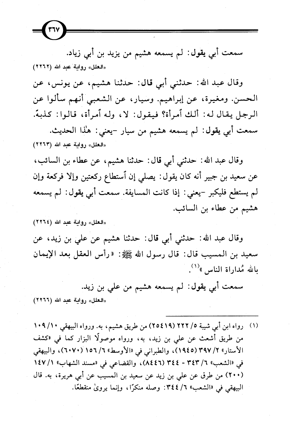 وقال عبد اللَّه: حدثني أبي قال: حدثنا هشيم عن علي بن زيد، عن سعيد بن المسيب قال: قال رسول اللَّه -صلى اللَّه عليه وسلم-: "رأس العقل بعد الإيمان باللَّه مُداراة الناس" (¬1).