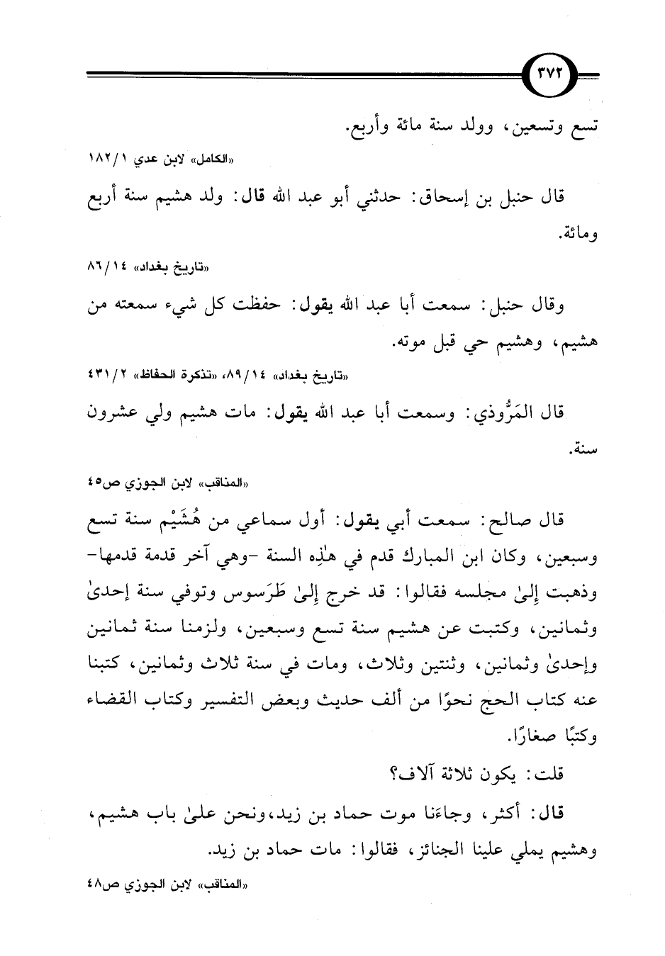 قال: أكثر، وجاءَنا موت حماد بن زيد، ونحن على باب هشيم، وهشيم يملي علينا الجنائز، فقالوا: مات حماد بن زيد.