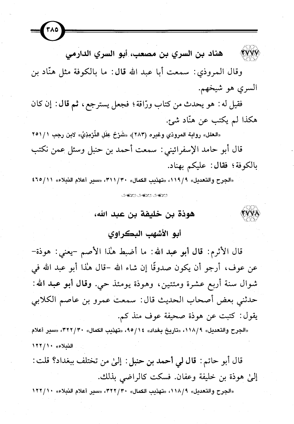 قال أبو حامد الإسفرائيني: سمعت أحمد بن حنبل وسئل عمن نكتب بالكوفة، فقال: عليكم بهناد.