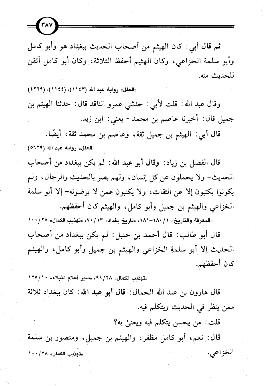 قال الفضل بن زياد: وقال أبو عبد اللَّه: لم يكن ببغداد من أصحاب الحديث -ولا يحملون عن كل إنسان، ولهم بصر بالحديث والرجال، ولم يكونوا يكتبون إلا عن الثقات، ولا يكتبون عمن لا يرضونه- إلا أبو سلمة الخزاعي والهيثم بن جميل وأبو كامل، والهيثم كان أحفظهم.