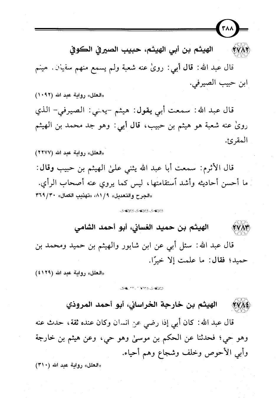 قال عبد اللَّه: سمعت أبي يقول: هيثم -يعني: الصيرفي- الذي روى عنه شعبة هو هيثم بن حبيب، قال أبي: وهو جد محمد بن الهيثم المقرئ.