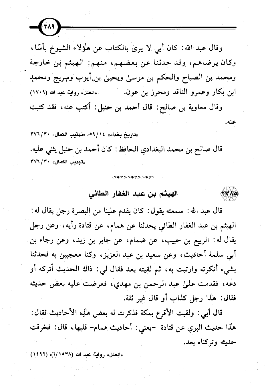 وقال عبد اللَّه: كان أبي لا يرى بالكتاب عن هؤلاء الشيوخ بأسًا، وكان يرضاهم، وقد حدثنا عن بعضهم، منهم: الهيثم بن خارجة ومحمد بن الصباح والحكم بن موسى ويحيى بن أيوب وسريج ومحمد ابن بكار وعمرو الناقد ومحرز بن عون.