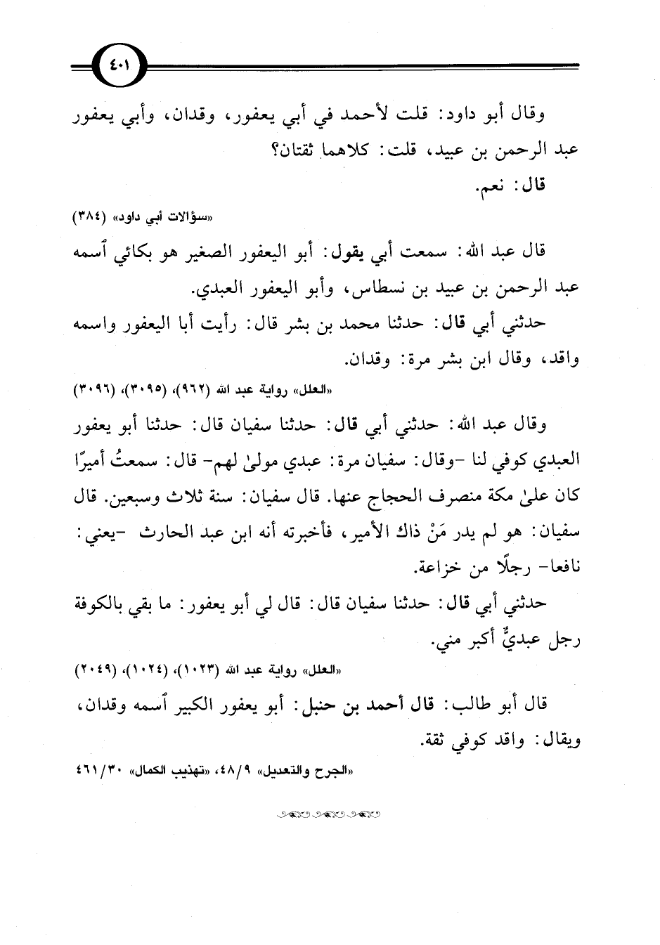 وقال أبو داود: قلت لأحمد في أبي يعفور، وقدان، وأبي يعفور عبد الرحمن بن عبيد، قلت: كلاهما ثقتان؟
