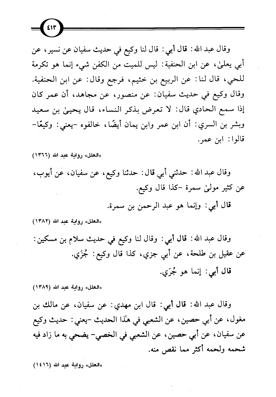 وقال عبد اللَّه: قال أبي: قال لنا وكيع في حديث سفيان عن نسير، عن أبي يعلى، عن ابن الحنفية: ليس للميت من الكفن شيء إنما هو تكرمة للحي، قال لنا: عن الربيع بن خثيم، فرجع وقال: عن ابن الحنفية. وقال وكيع في حديث سفيان: عن منصور، عن مجاهد، أن عمر كان إذا سمع الحادي قال: لا تعرض بذكر النساء، قال يحيى بن سعيد وبشر بن السري: أن ابن عمر وابن يمان أيضًا، خالفوه -يعني: وكيعًا- قالوا: ابن عمر.