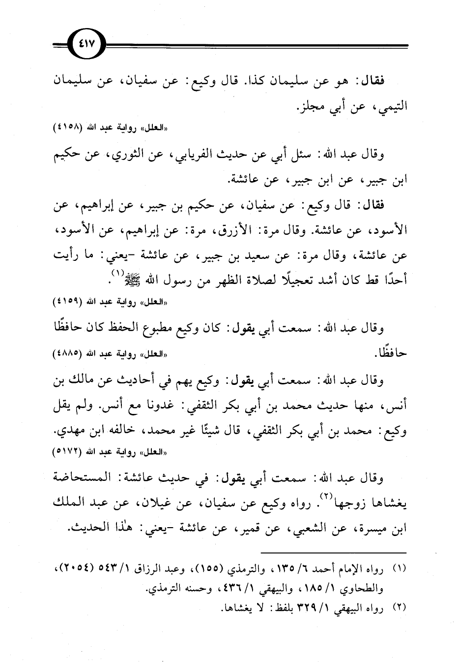 وقال عبد اللَّه: سئل أبي عن حديث الفريابي، عن الثوري، عن حكيم ابن جبير، عن ابن جبير، عن عائشة.