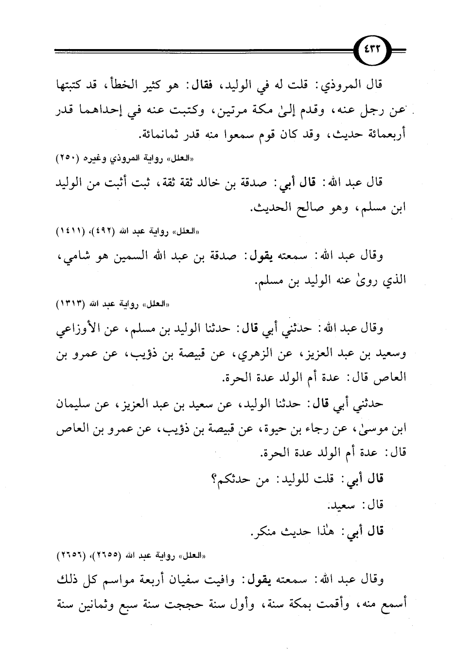 وقال عبد اللَّه: حدثني أبي قال: حدثنا الوليد بن مسلم، عن الأوزاعي وسعيد بن عبد العزيز، عن الزهري، عن قبيصة بن ذؤيب، عن عمرو بن العاص قال: عدة أم الولد عدة الحرة.