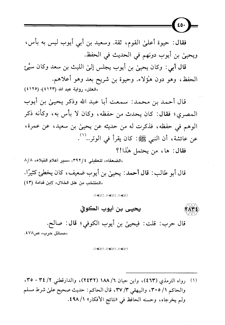 قال أحمد بن محمد: سمعت أبا عبد اللَّه وذكر يحيى بن أيوب المصري؛ فقال: كان يحدث من حفظه، وكان لا بأس به، وكأنه ذكر الوهم في حفظه، فذكرت له من حديثه عن يحيى بن سعيد، عن عمرة، عن عائشة، أن النبي -صلى اللَّه عليه وسلم-: كان يقرأ في الوتر. . (¬1).