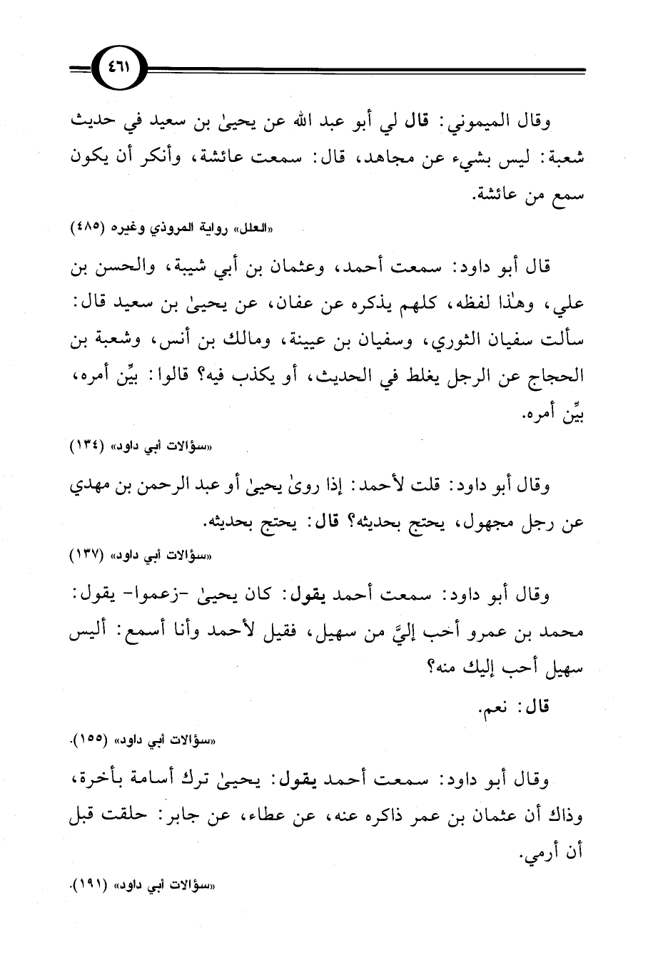 وقال أبو داود: قلت لأحمد: إذا روى يحيى أو عبد الرحمن بن مهدي عن رجل مجهول، يحتج بحديثه؟ قال: يحتج بحديثه.