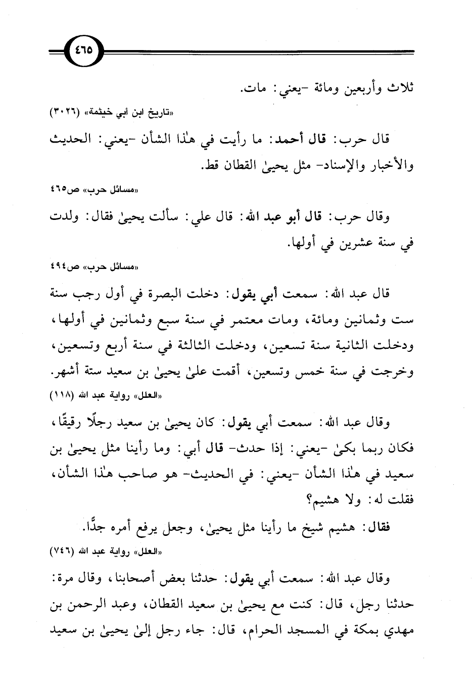 قال حرب: قال أحمد: ما رأيت في هذا الشأن -يعني: الحديث والأخبار والإسناد- مثل يحيى القطان قط.