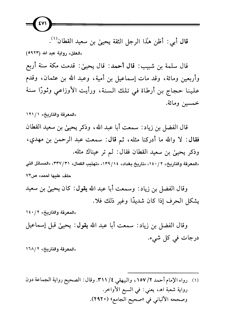 "المعرفة والتاريخ" 2/ 140، "تاريخ بغداد" 14/ 139، "تهذيب الكمال" 31/ 337، "المسائل التي حلف عليها أحمد" ص 72