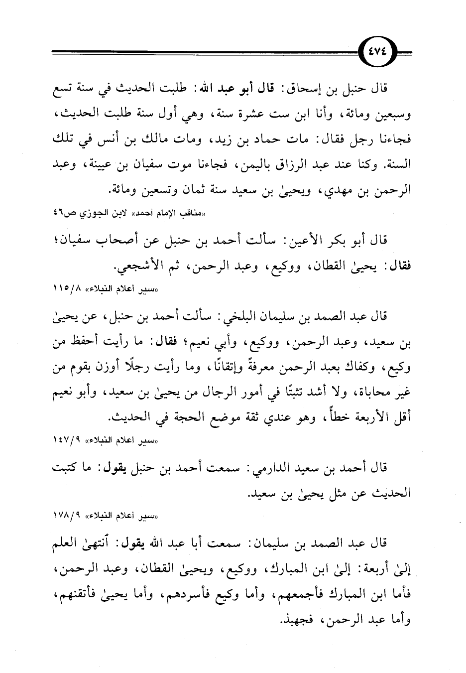 قال أحمد بن سعيد الدارمي: سمعت أحمد بن حنبل يقول: ما كتبت الحديث عن مثل يحيى بن سعيد.