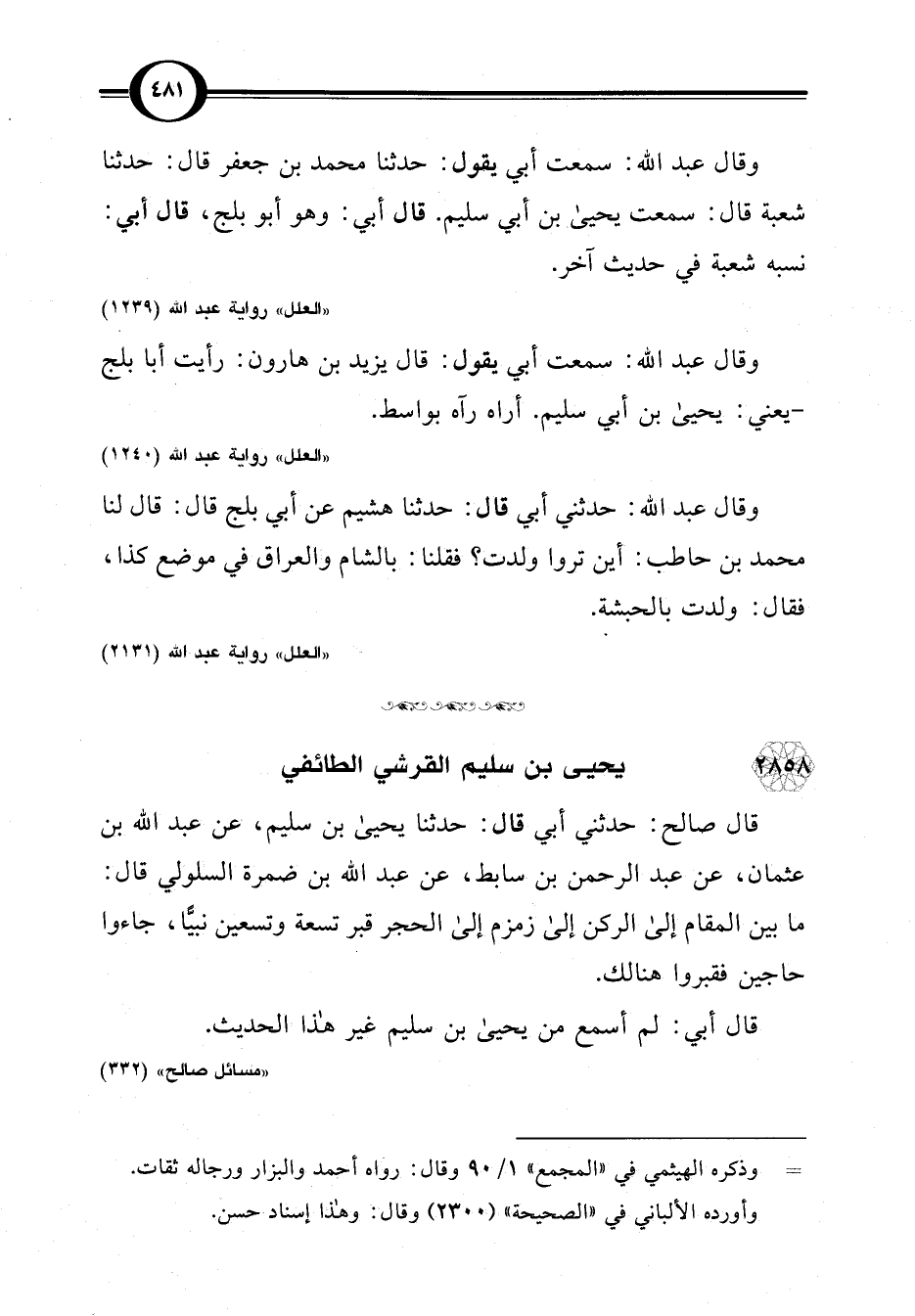 وقال عبد اللَّه: سمعت أبي يقول: حدثنا محمد بن جعفر قال: حدثنا شعبة قال: سمعت يحيى بن أبي سليم. قال أبي: وهو أبو بلج، قال أبي: نسبه شعبة في حديث آخر.
