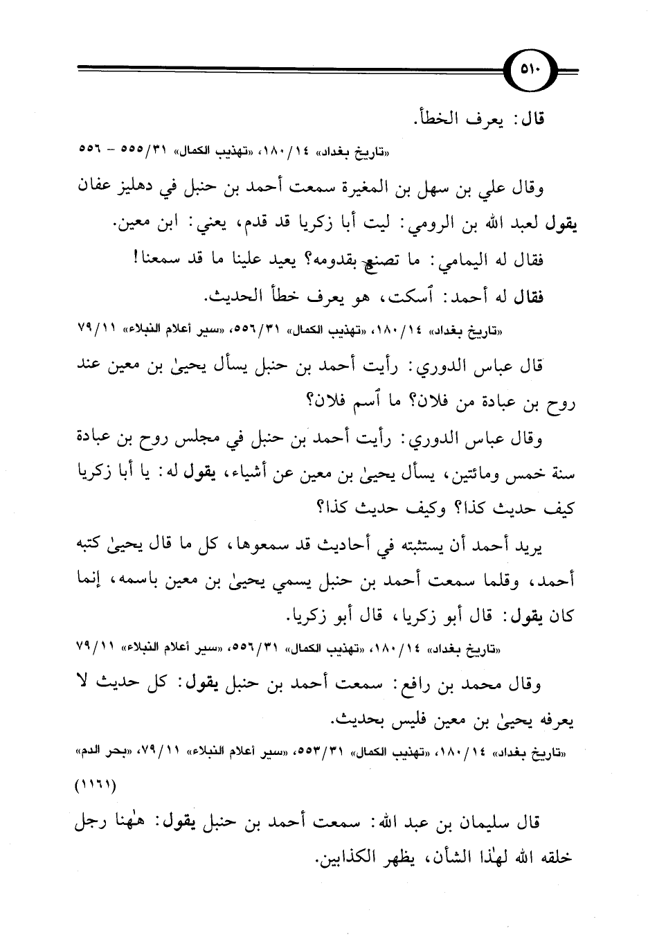 "تاريخ بغداد" 14/ 180، "تهذيب الكمال" 31/ 553، "سير أعلام النبلاء" 11/ 79، "بحر الدم" (1161)