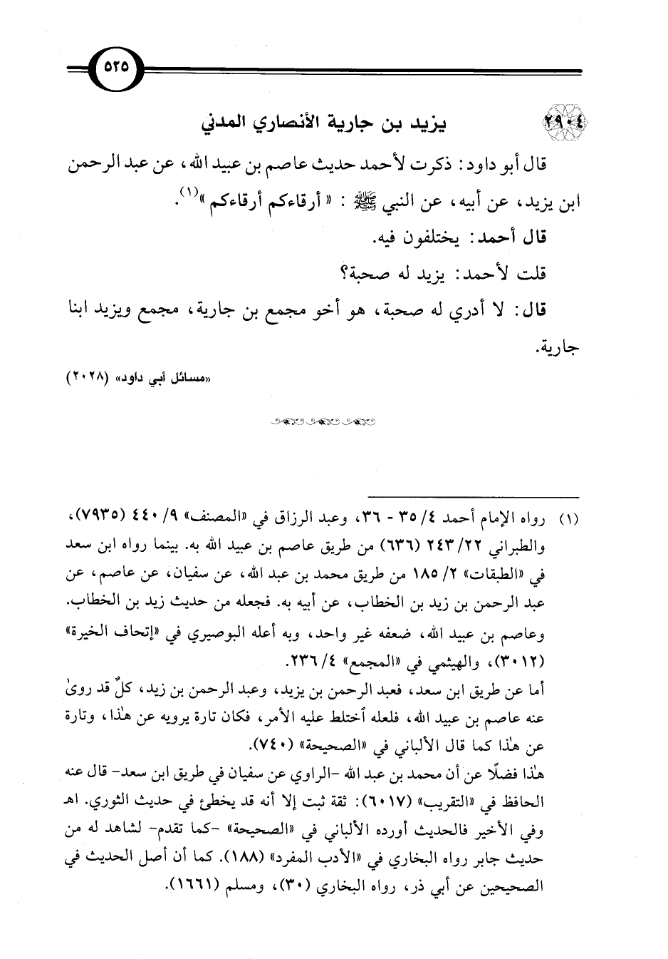 (¬1) رواه الإمام أحمد 4/ 35 - 36، وعبد الرزاق في "المصنف" 9/ 440 (7935)، والطبراني 22/ 243 (636) من طريق عاصم بن عبيد اللَّه به. بينما رواه ابن سعد في "الطبقات" 2/ 185 من طريق محمد بن عبد اللَّه، عن سفيان، عن عاصم، عن عبد الرحمن بن زيد بن الخطاب، عن أبيه به. فجعله من حديث زيد بن الخطاب. وعاصم بن عبيد اللَّه، ضعفه غير واحد، وبه أعله البوصيري في "إتحاف الخيرة" (3012)، والهيثمي في "المجمع" 4/ 236.
