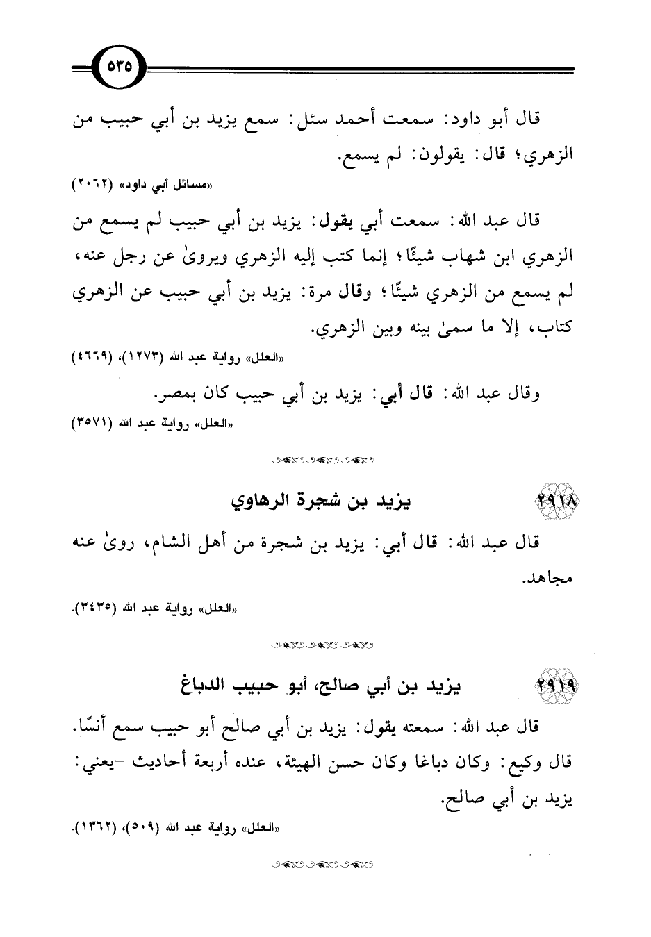 قال عبد اللَّه: سمعت أبي يقول: يزيد بن أبي حبيب لم يسمع من الزهري ابن شهاب شيئًا؛ إنما كتب إليه الزهري ويروى عن رجل عنه، لم يسمع من الزهري شيئًا، وقال مرة: يزيد بن أبي حبيب عن الزهري كتاب، إلا ما سمى بينه وبين الزهري.