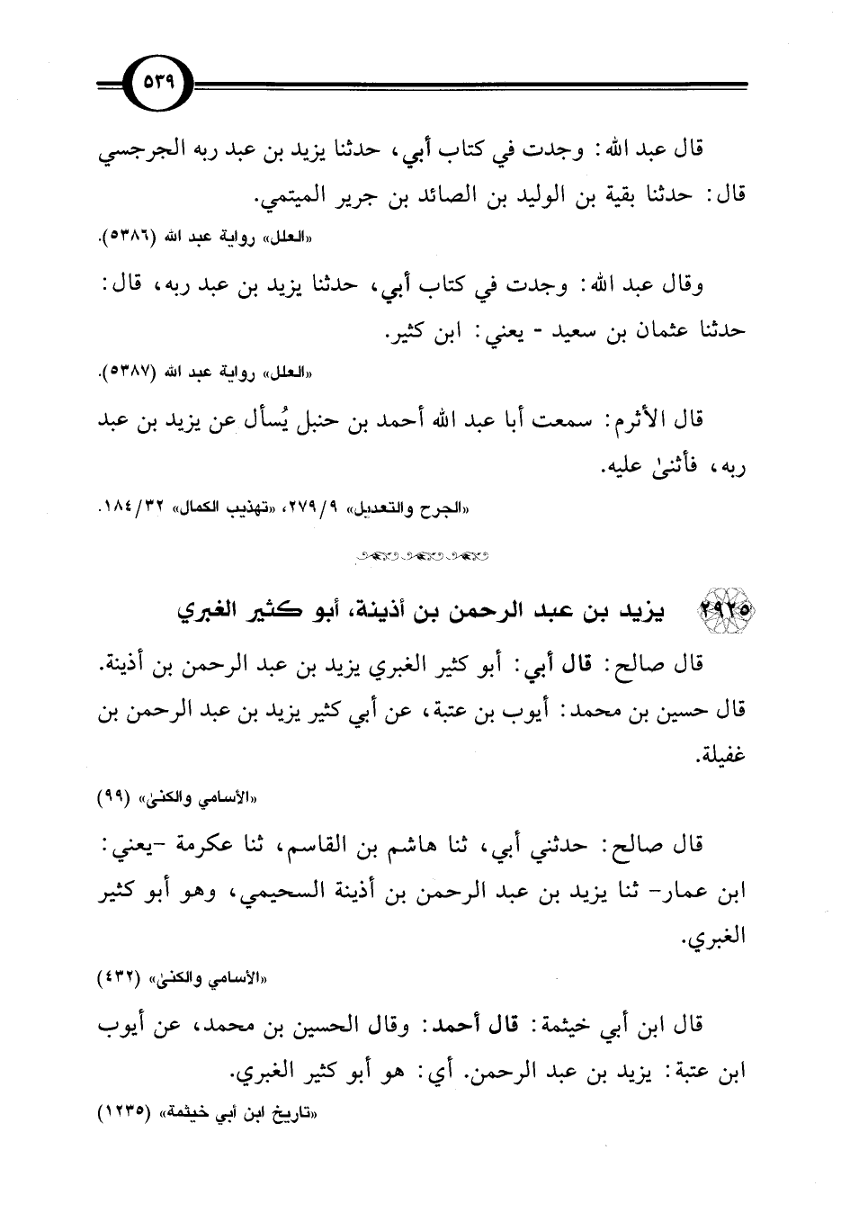 وقال عبد اللَّه: وجدت في كتاب أبي، حدثنا يزيد بن عبد ربه، قال: حدثنا عثمان بن سعيد -يعني: ابن كثير.