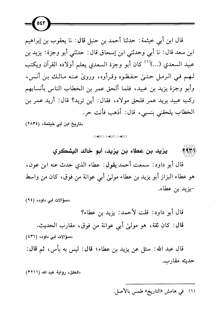 قال ابن أبي خيثمة: حدثنا أحمد بن حنبل قال: نا يعقوب بن إبراهيم ابن سعد قال: نا أبي وحدثني ابن إسحاق قال: حدثني أبو وجزة: يزيد بن عبيد السعدي ( .. .) (¬1) كان أبو وجزة السعدي يعلم أولاده القرآن ويكتب لهم في الرمل حتى حفظوه وقرأوه، وروى عنه مالك بن أنس، وأبو وجزة يزيد بن عبيد، فلما ألحق عمر بن الخطاب الناس بأنسابهم ركب عبيد يريد عمر فلحق مولاه، فقال: أين تريد؟ قال: أريد عمر بن الخطاب يلحقني بنسبي، قال: اذهب فأنت حر.