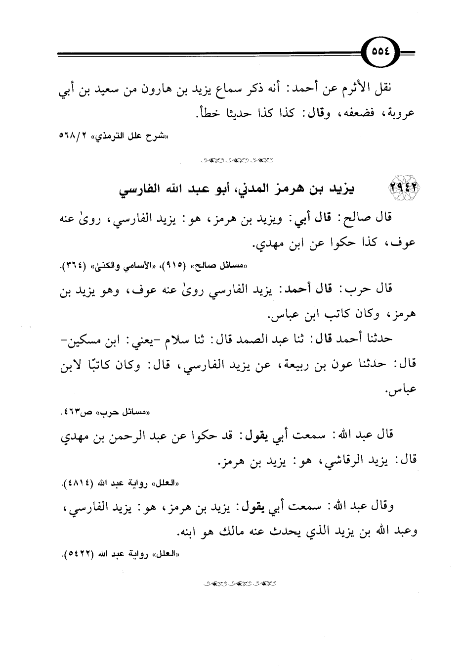 قال صالح: قال أبي: ويزيد بن هرمز، هو: يزيد الفارسي، روى عنه عوف، كذا حكوا عن ابن مهدي.