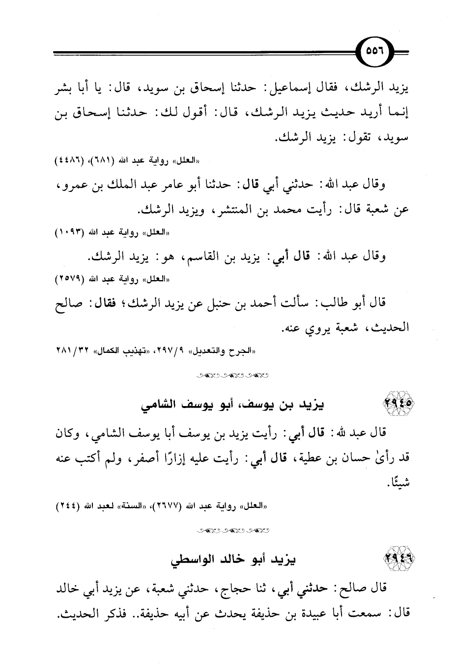 وقال عبد اللَّه: حدثني أبي قال: حدثنا أبو عامر عبد الملك بن عمرو، عن شعبة قال: رأيت محمد بن المنتشر، ويزيد الرشك.