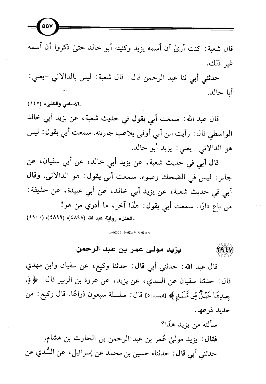 قال عبد اللَّه: سمعت أبي يقول في حديث شعبة، عن يزيد أبي خالد الواسطي قال: رأيت ابن أبي أوفى يلاعب جاريته. سمعت أبي يقول: ليس هو الدالاني -يعني: يزيد أبو خالد.