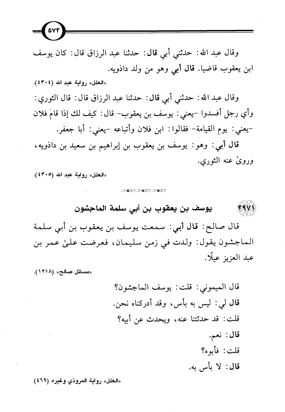 وقال عبد اللَّه: حدثني أبي قال: حدثنا عبد الرزاق قال: كان يوسف ابن يعقوب قاضيا. قال أبي وهو من ولد داذويه.