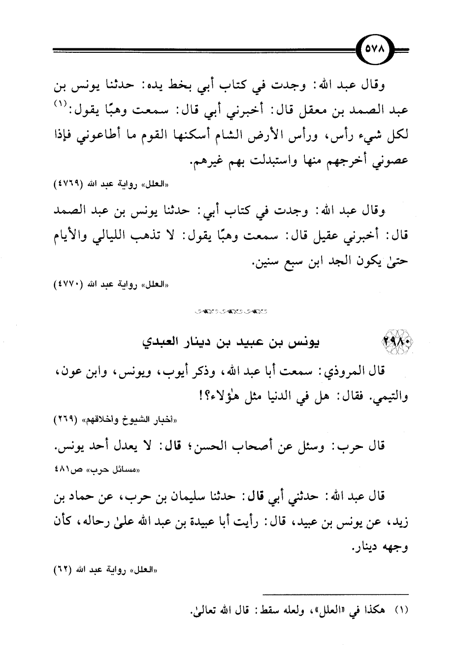 قال عبد اللَّه: حدثني أبي قال: حدثنا سليمان بن حرب، عن حماد بن زيد، عن يونس بن عبيد، قال: رأيت أبا عبيدة بن عبد اللَّه على رحاله، كأن وجهه دينار.