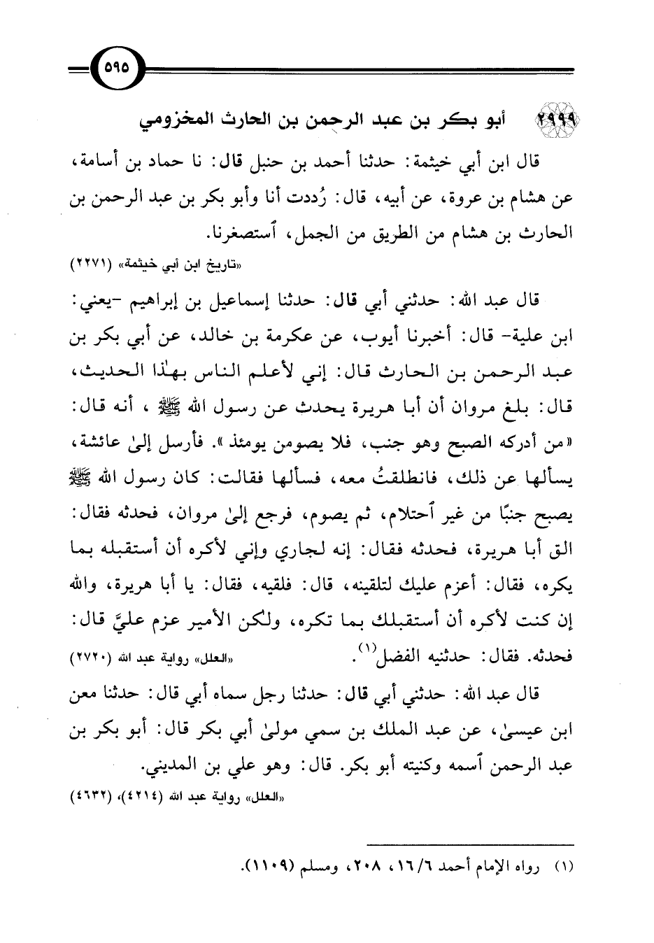 قال عبد اللَّه: حدثني أبي قال: حدثنا إسماعيل بن إبراهيم -يعني: ابن علية- قال: أخبرنا أيوب، عن عكرمة بن خالد، عن أبي بكر بن عبد الرحمن بن الحارث قال: إني لأعلم الناس بهذا الحديث، قال: بلغ مروان أن أبا هريرة يحدث عن رسول اللَّه -صلى اللَّه عليه وسلم-، أنه قال: "من أدركه الصبح وهو جنب، فلا يصومن يومئذ". فأرسل إلى عائشة، يسألها عن ذلك، فانطلقتُ معه، فسألها فقالت: كان رسول اللَّه -صلى اللَّه عليه وسلم- يصبح جنبًا من غير احتلام، ثم يصوم، فرجع إلى مروان، فحدثه فقال: الق أبا هريرة، فحدثه فقال: إنه لجاري وإني لأكره أن أستقبله بما يكره، فقال: أعزم عليك لتلقينه، قال: فلقيه، فقال: يا أبا هريرة، واللَّه إن كنت لأكره أن أستقبلك بما تكره، ولكن الأمير عزم عليَّ قال: فحدثه. فقال: حدثنيه الفضل (¬1).