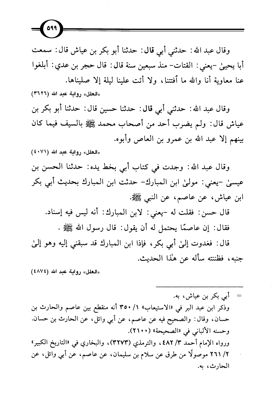 وقال عبد اللَّه: وجدت في كتاب أبي بخط يده: حدثنا الحسن بن عيسى -يعني: مولى ابن المبارك- حدثت ابن المبارك بحديث أبي بكر ابن عياش، عن عاصم، عن النبي -صلى اللَّه عليه وسلم-.