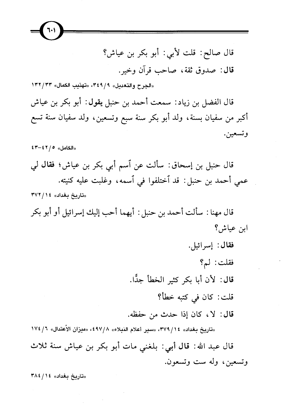 قال مهنا: سألت أحمد بن حنبل: أيهما أحب إليك إسرائيل أو أبو بكر ابن عياش؟