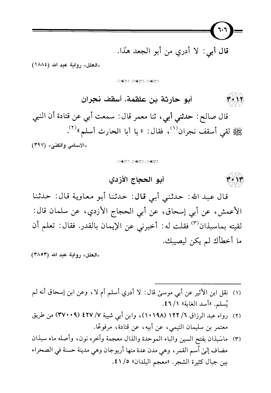 قال عبد اللَّه: حدثني أبي قال: حدثنا أبو معاوية قال: حدثنا الأعمش، عن أبي إسحاق، عن أبي الحجاج الأزدي، عن سلمان قال: لقيته بماسبذان (¬3) فقلت له: أخبرني عن الإيمان بالقدر. فقال: تعلم أن ما أخطأك لم يكن ليصيبك.