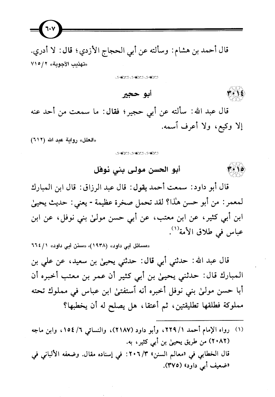 قال أبو داود: سمعت أحمد يقول: قال عبد الرزاق: قال ابن المبارك لمعمر: من أبو حسن هذا؟ لقد تحمل صخرة عظيمة -يعني: حديث يحيى ابن أبي كثير، عن ابن معتب، عن أبي حسن مولى بني نوفل، عن ابن عباس في طلاق الأمة (¬1).