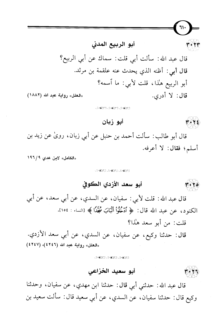 قال عبد اللَّه: حدثني أبي قال: حدثنا ابن مهدي، عن سفيان، وحدثنا وكيع قال: حدثنا سفيان، عن السدي، عن أبي سعيد قال: سألت سعيد بن