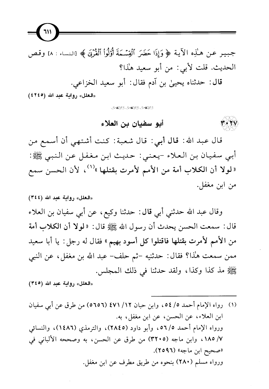 قال عبد اللَّه: قال أبي: قال شعبة: كنت أشتهي أن أسمع من أبي سفيان بن العلاء -يعني: حديث ابن مغفل عن النبي -صلى اللَّه عليه وسلم-: "لولا أن الكلاب أمة من الأمم لأمرت بقتلها" (¬1)، لأن الحسن سمع من ابن مغفل.