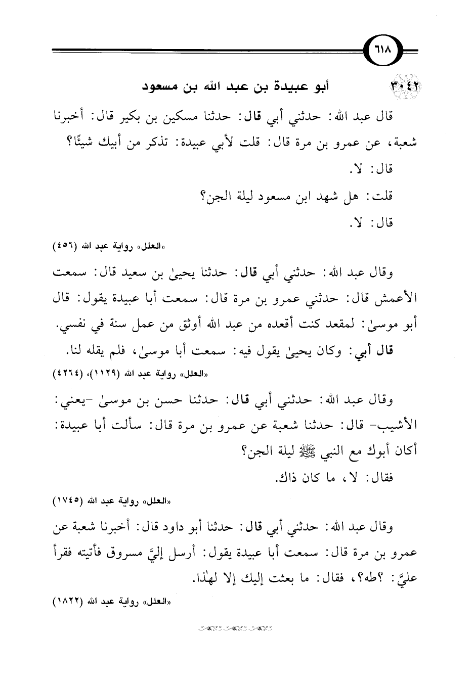 وقال عبد اللَّه: حدثني أبي قال: حدثنا حسن بن موسى -يعني: الأشيب- قال: حدثنا شعبة عن عمرو بن مرة قال: سألت أبا عبيدة: أكان أبوك مع النبي -صلى اللَّه عليه وسلم- ليلة الجن؟