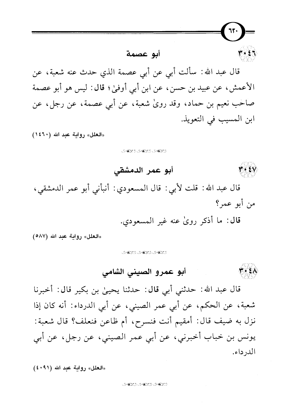 قال عبد اللَّه: قلت لأبي: قال المسعودي: أنبأني أبو عمر الدمشقي، من أبو عمر؟