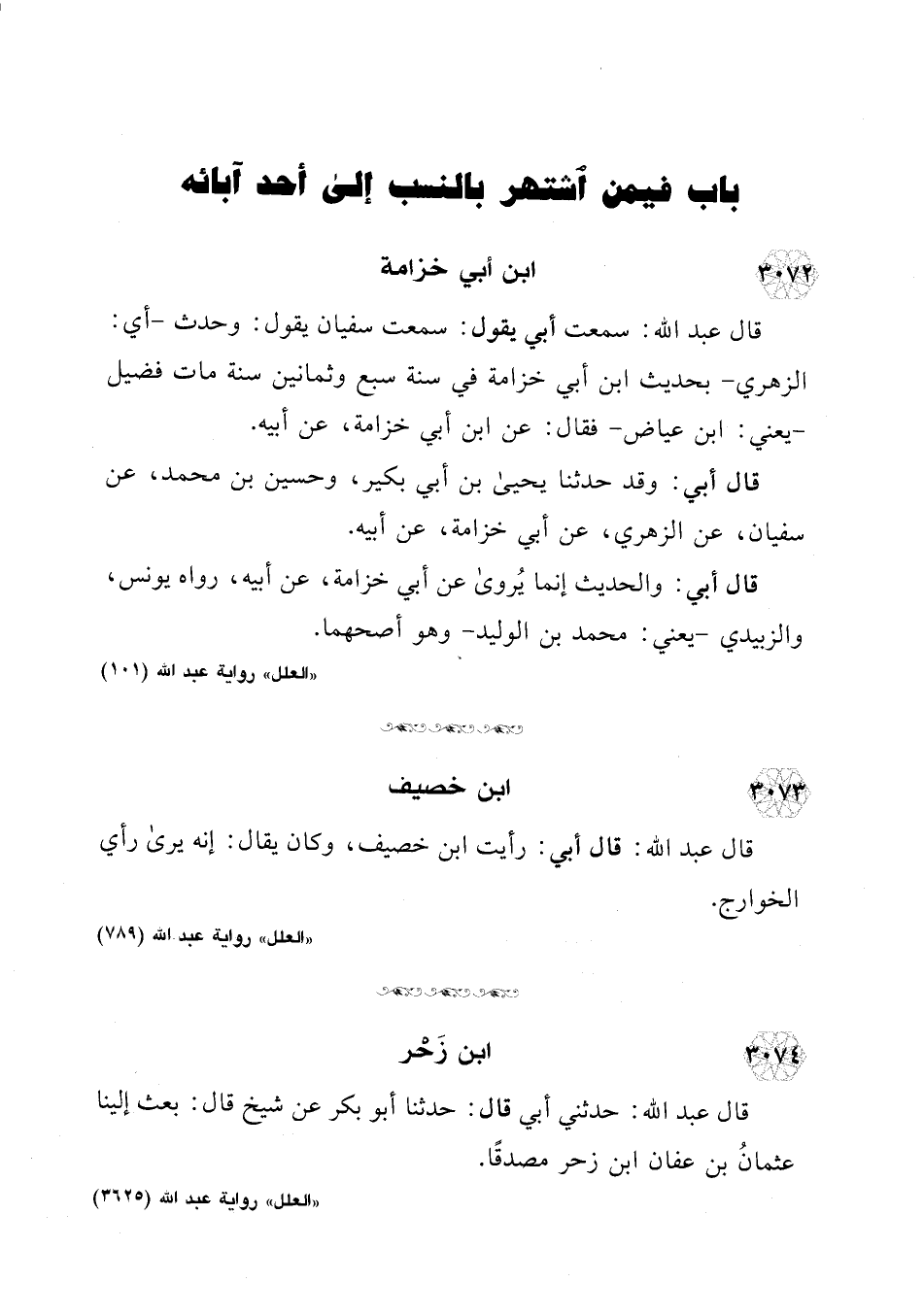 قال عبد اللَّه: سمعت أبي يقول: سمعت سفيان يقول: وحدث -أي: الزهري- بحديث ابن أبي خزامة في سنة سبع وثمانين سنة مات فضيل -يعني: ابن عياض- فقال: عن ابن أبي خزامة، عن أبيه.