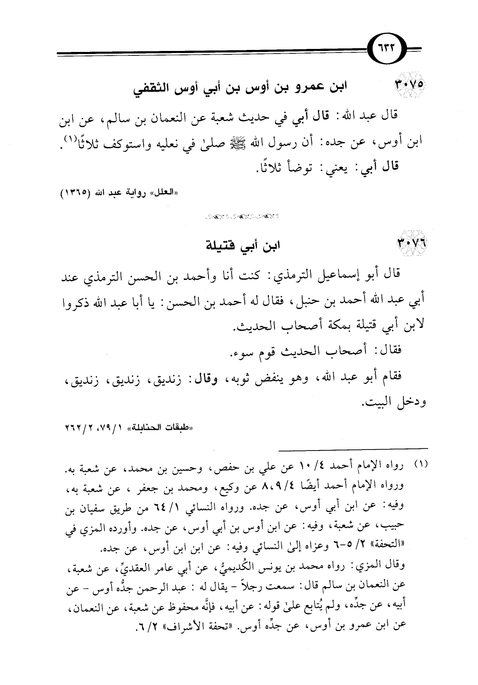 قال عبد اللَّه: قال أبي في حديث شعبة عن النعمان بن سالم، عن ابن ابن أوس، عن جده: أن رسول اللَّه -صلى اللَّه عليه وسلم- صلى في نعليه واستوكف ثلاثًا (¬1).