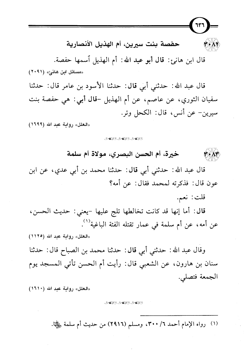 وقال عبد اللَّه: حدثني أبي قال: حدثنا محمد بن الصباح قال: حدثنا سنان بن هارون، عن الشعبي قال: رأيت أم الحسن تأتي المسجد يوم الجمعة فتصلي.