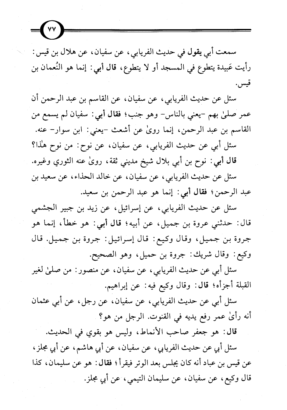 سئل عن حديث الفريابي، عن سفيان، عن القاسم بن عبد الرحمن أن عمر صلى بهم -يعني بالناس- وهو جنب؛ فقال أبي: سفيان لم يسمع من القاسم بن عبد الرحمن، إنما روى عن أشعث -يعني: ابن سوار- عنه.