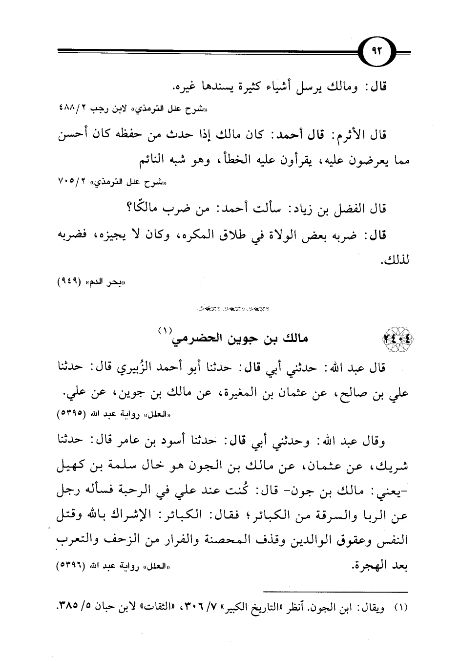 وقال عبد اللَّه: وحدثني أبي قال: حدثنا أسود بن عامر قال: حدثنا شريك، عن عثمان، عن مالك بن الجون هو خال سلمة بن كهيل -يعني: مالك بن جون- قال: كُنت عند على في الرحبة فسأله رجل عن الربا والسرقة من الكبائر؛ فقال: الكبائر: الإشراك باللَّه وقتل النفس وعقوق الوالدين وقذف المحصنة والفرار من الزحف والتعرب بعد الهجرة.