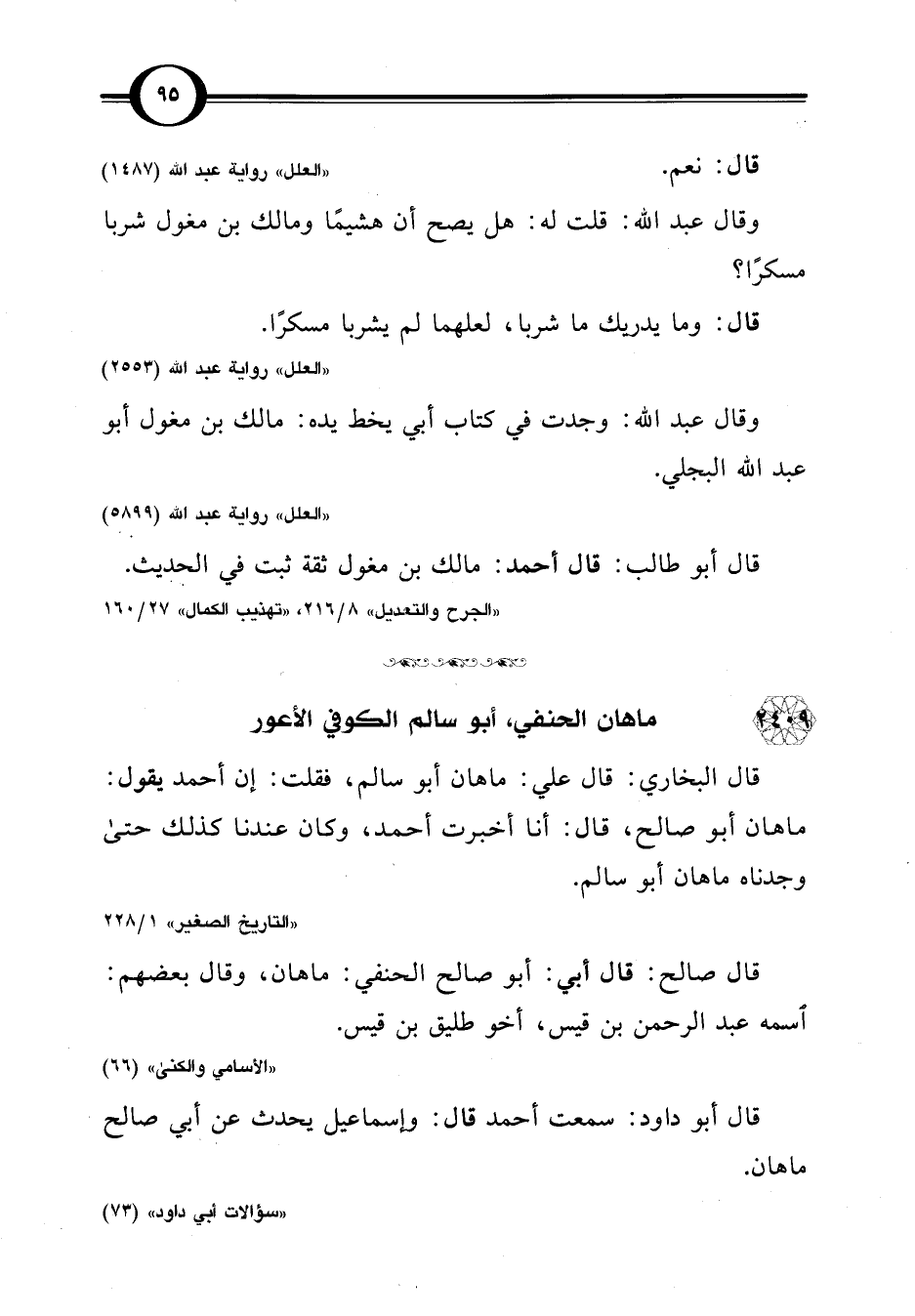 وقال عبد اللَّه: وجدت في كتاب أبي يخط يده: مالك بن مغول أبو عبد اللَّه البجلي.