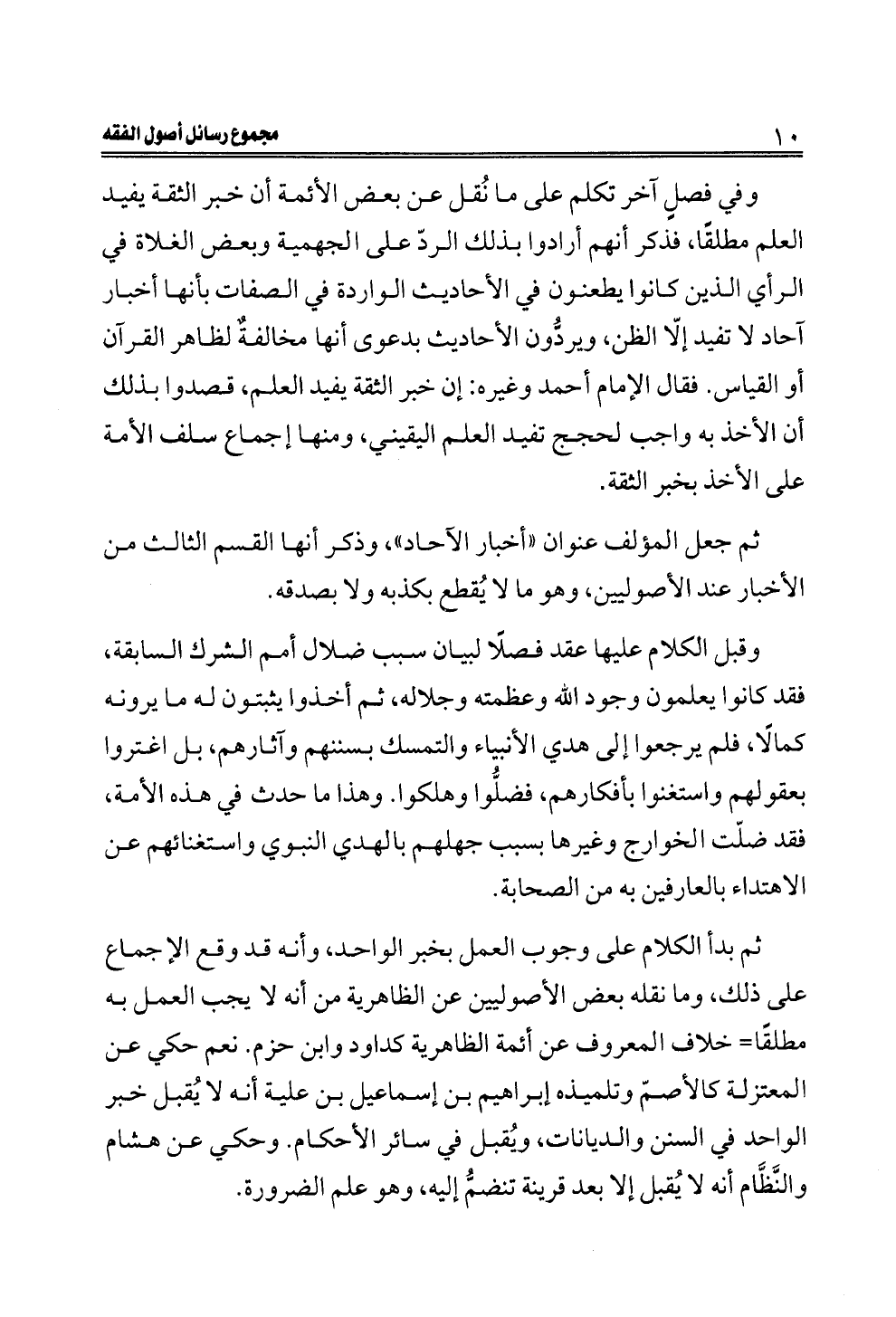 ثم بدأ الكلام على وجوب العمل بخبر الواحد، وأنه قد وقع الإجماع على ذلك، وما نقله بعض الأصوليين عن الظاهرية من أنه لا يجب العمل به مطلقًا= خلاف المعروف عن أئمة الظاهرية كداود وابن حزم. نعم حكي عن المعتزلة كالأصمّ وتلميذه إبراهيم بن إسماعيل بن علية أنه لا يُقبل خبر الواحد في السنن والديانات، ويُقبل في سائر الأحكام. وحكي عن هشام والنَّظَّام أنه لا يُقبل إلا بعد قرينة تنضمُّ إليه، وهو علم الضرورة.
