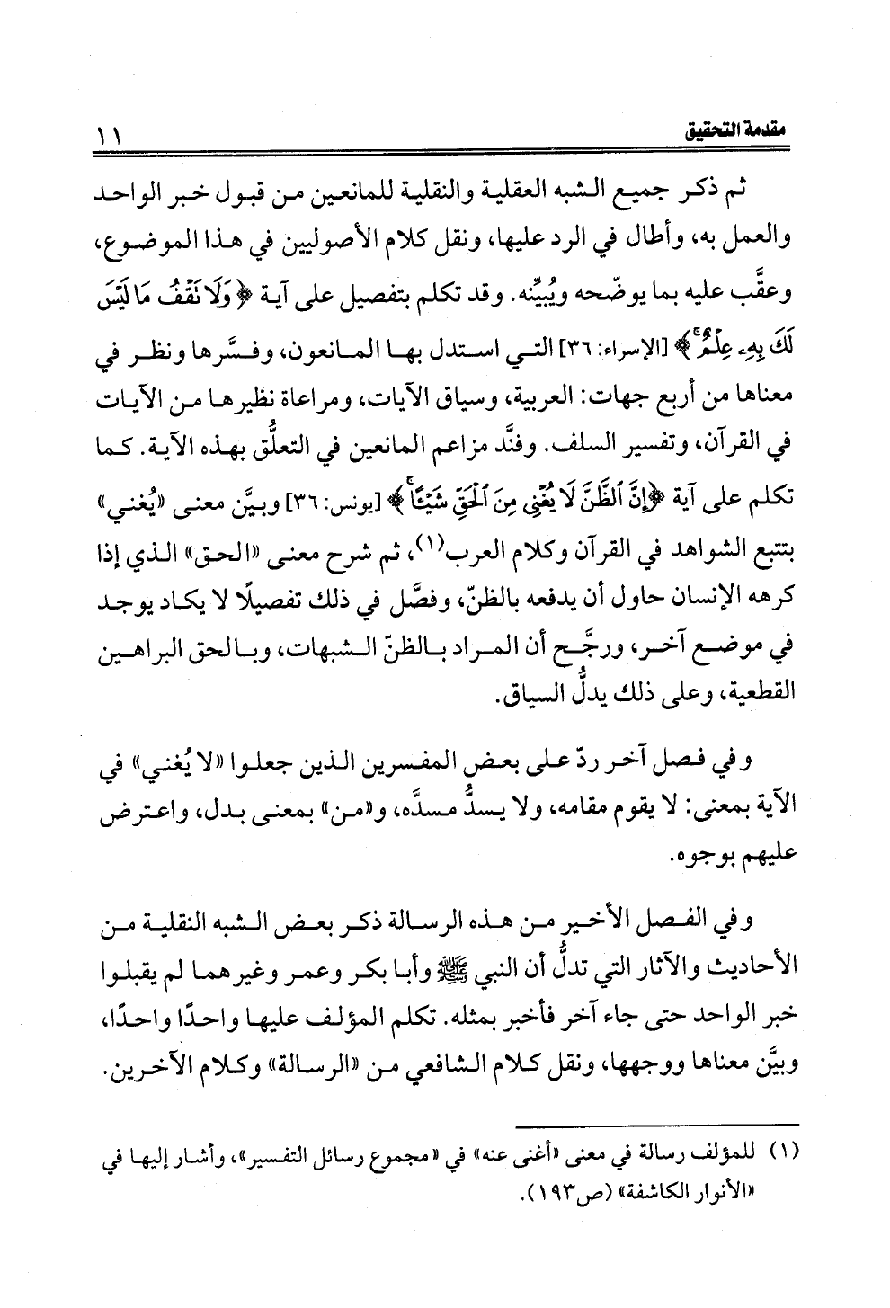 ثم ذكر جميع الشبه العقلية والنقلية للمانعين من قبول خبر الواحد والعمل به، وأطال في الرد عليها، ونقل كلام الأصوليين في هذا الموضوع، وعقَّب عليه بما يوضّحه ويُبيِّنه. وقد تكلم بتفصيل على آية {وَلَا تَقْفُ مَا لَيْسَ لَكَ بِهِ عِلْمٌ} [الإسراء: ٣٦] التي استدل بها المانعون، وفسَّرها ونظر في معناها من أربع جهات: العربية، وسياق الآيات، ومراعاة نظيرها من الآيات في القرآن، وتفسير السلف. وفنَّد مزاعم المانعين في التعلُّق بهذه الآية. كما تكلم على آية {إِنَّ الظَّنَّ لَا يُغْنِي مِنَ الْحَقِّ شَيْئًا} [يونس: ٣٦] وبيَّن معنى "يُغني" بتتبع الشواهد في القرآن وكلام العرب (¬١)، ثم شرح معنى "الحق" الذي إذا كرهه الإنسان حاول أن يدفعه بالظنّ، وفصَّل في ذلك تفصيلًا لا يكاد يوجد في موضع آخر، ورجَّح أن المراد بالظنّ الشبهات، وبالحق البراهين القطعية، وعلى ذلك يدلُّ السياق.