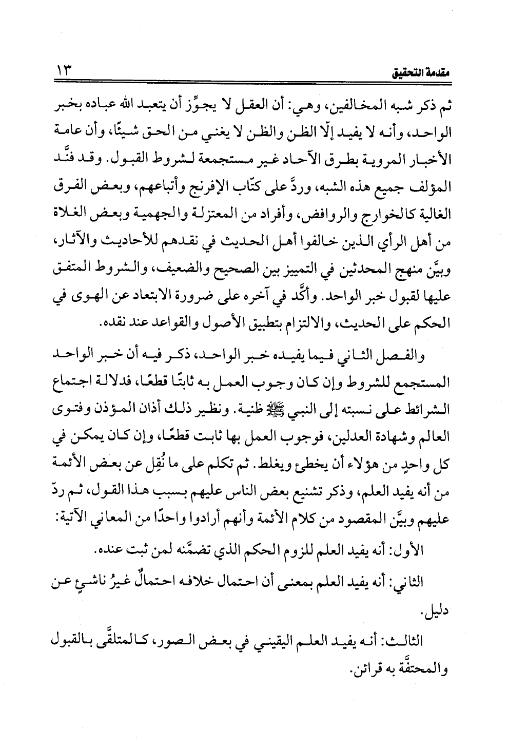 ثم ذكر شبه المخالفين، وهي: أن العقل لا يجوِّز أن يتعبد الله عباده بخبر الواحد، وأنه لا يفيد إلّا الظن والظن لا يغني من الحق شيئًا، وأن عامة الأخبار المروية بطرق الآحاد غير مستجمعة لشروط القبول. وقد فنَّد المؤلف جميع هذه الشبه، وردَّ على كتّاب الإفرنج وأتباعهم، وبعض الفرق الغالية كالخوارج والروافض، وأفراد من المعتزلة والجهمية وبعض الغلاة من أهل الرأي الذين خالفوا أهل الحديث في نقدهم للأحاديث والآثار، وبيَّن منهج المحدثين في التمييز بين الصحيح والضعيف، والشروط المتفق عليها لقبول خبر الواحد. وأكَّد في آخره على ضرورة الابتعاد عن الهوى في الحكم على الحديث، والالتزام بتطبيق الأصول والقواعد عند نقده.