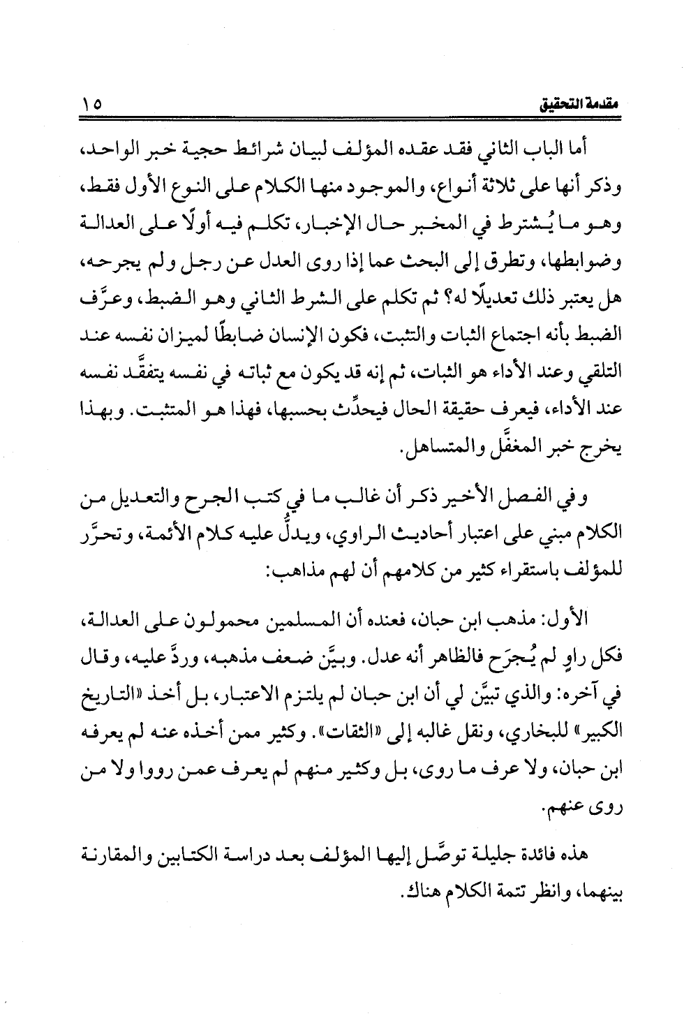 الأول: مذهب ابن حبان، فعنده أن المسلمين محمولون على العدالة، فكل راوٍ لم يُجرَح فالظاهر أنه عدل. وبيَّن ضعف مذهبه، وردَّ عليه، وقال في آخره: والذي تبيَّن لي أن ابن حبان لم يلتزم الاعتبار، بل أخذ "التاريخ الكبير" للبخاري، ونقل غالبه إلى "الثقات". وكثير ممن أخذه عنه لم يعرفه ابن حبان، ولا عرف ما روى، بل وكثير منهم لم يعرف عمن رووا ولا من روى عنهم.